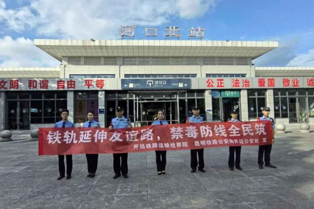 6月25日,开远铁检院联合开远铁路运输法院、开远铁路公安处深入辖区河口站开展以“铁轨延伸友谊路,禁毒防线全民筑”为主题的禁毒宣传活动,横幅迎风招展,大家手脚麻利地张贴海报,向旅客、商户递上禁毒宣传单。“这种粉末状的可能是新型毒品,一定要提高警惕!”面对群众的咨询,检察官耐心讲解,现场气氛热烈而有序。活动当天,4张海报张贴完毕,300余张宣传单发放到位,10余人咨询获得解答,500余名群众接受教育,筑牢了边境铁路的禁毒防线。
