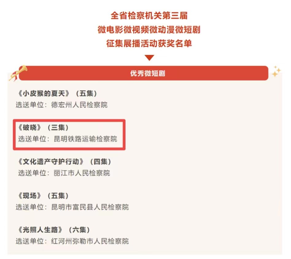 日前,由云南省人民检察院组织开展的全省检察机关第三届微电影微视频微动漫微短剧作品征集展播活动获奖结果揭晓。经组织推选、初评、终评,在报送的90部作品中,5部作品被评为“优秀微电影”,10部作品被评为“优秀微视频”,5部作品被评为“优秀微动漫”,5部作品被评为“优秀微短剧”,6个单位荣获组织奖。其中,昆明铁检机关原创微短剧《破晓》从众多作品中脱颖而出,获评“优秀微短剧”。