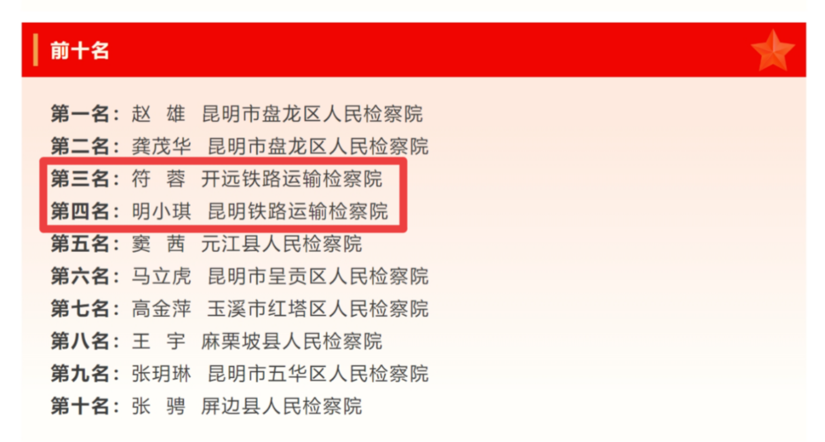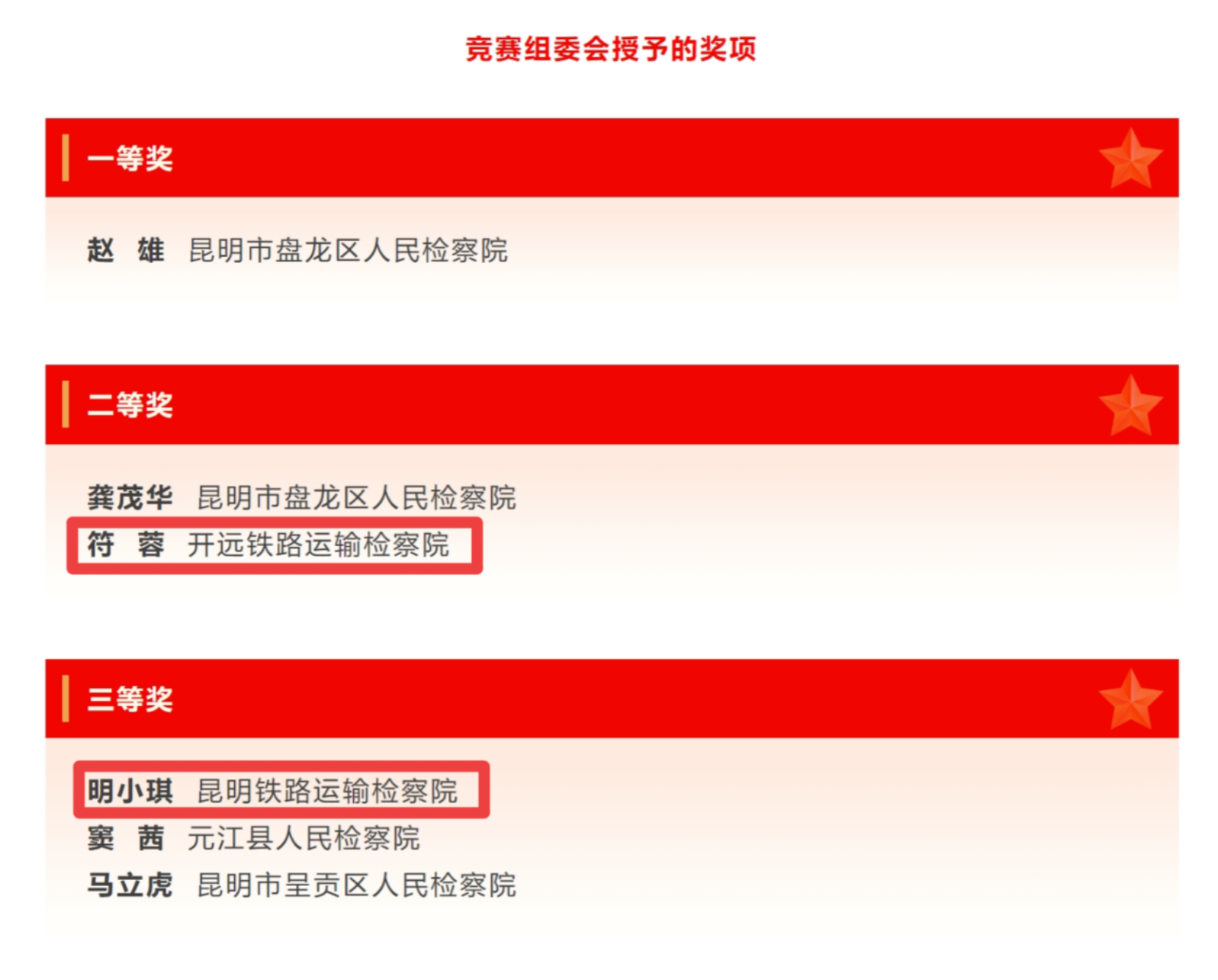 下一步,昆明铁检机关将以此次竞赛佳绩为契机,以获奖人员为标杆,持续深化检察队伍专业化建设,把竞赛中锤炼的专业能力、拼搏精神转化为履职实效,聚焦铁路运输领域重点案件办理,深耕法律监督主业,不断提升办案质效与司法公信力。秉持对法律的敬畏之心、对事业的赤诚之心,踔厉奋发、笃行不怠,全力守护铁路运输安全与社会公平正义,为昆明铁检机关高质量发展书写更加绚丽的篇章!