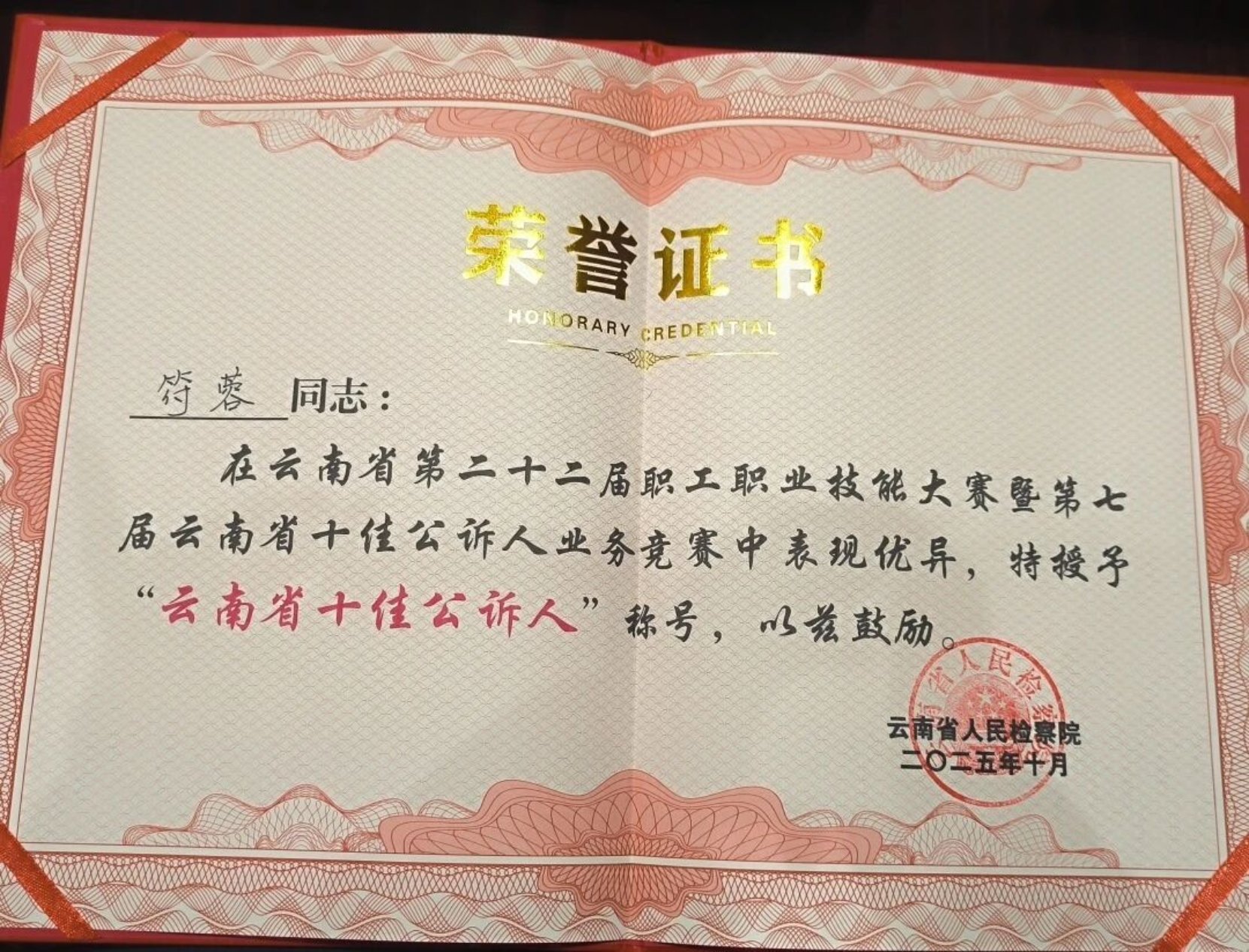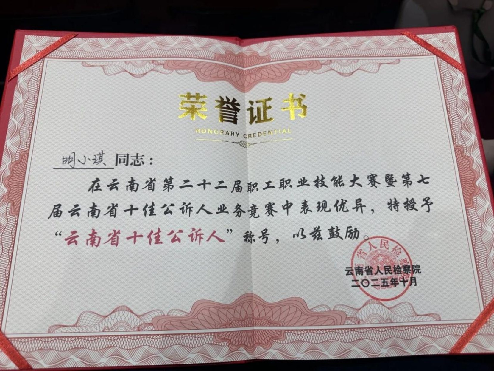 10月17日,由省总工会、省人力资源和社会保障厅、省科学技术厅、省工业和信息化厅及省人民政府国有资产监督管理委员会主办,云南省人民检察院承办的云南省第二十二届职工职业技能大赛暨第七届云南省十佳公诉人业务竞赛圆满落幕。经过激烈角逐,昆明铁检机关两名参赛检察人员凭借扎实的业务功底和稳定的现场发挥,从全省公诉精英中脱颖而出,斩获佳绩,分别荣获二等奖、三等奖、十佳公诉人等荣誉。