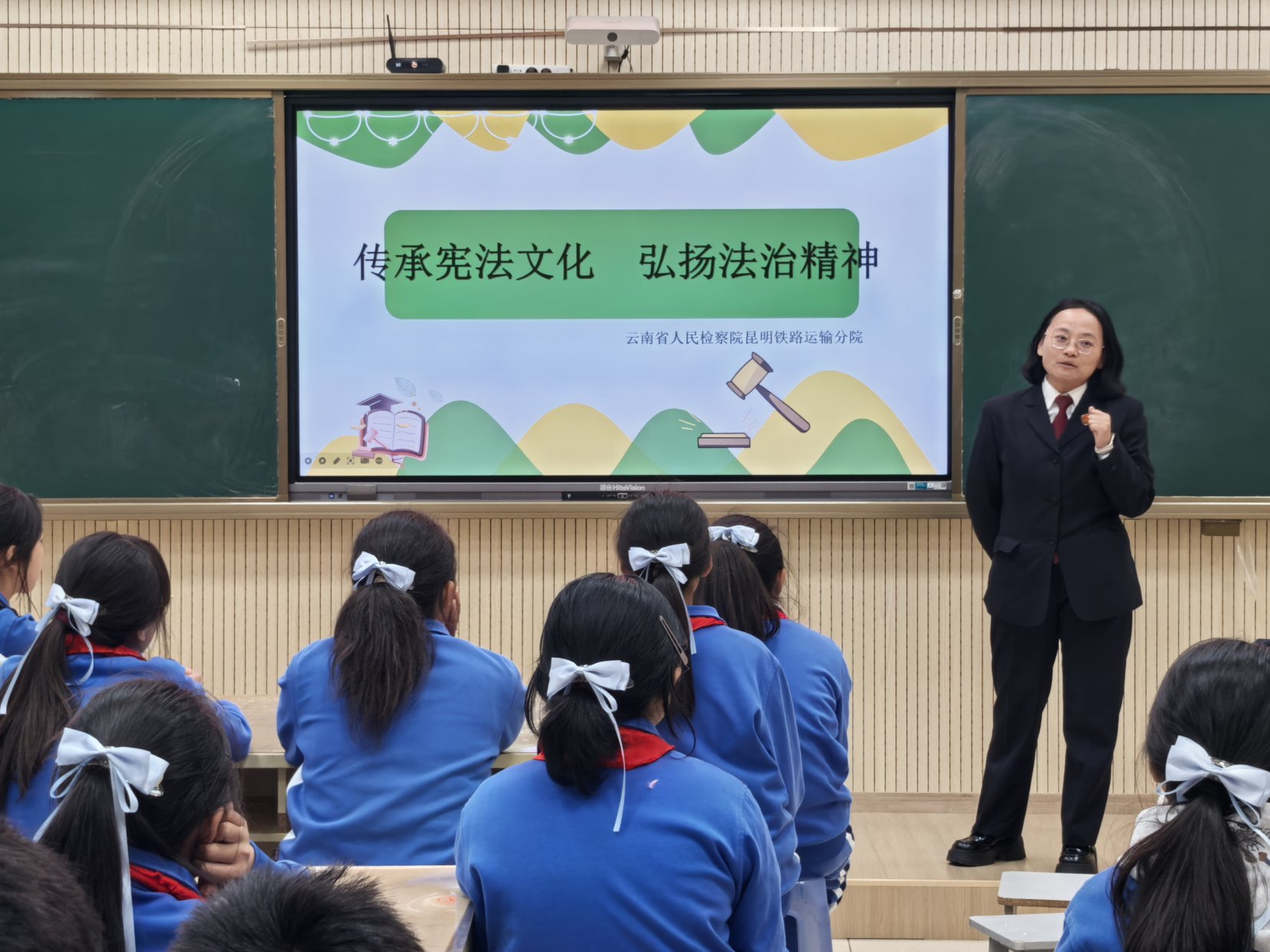 12 月 4 日,在第十二个国家宪法日到来之际,云南省人民检察院昆明铁路运输分院(下称“昆明铁检分院”)组织开展了以“传承宪法文化 弘扬法治精神”为主题的宪法宣传进校园活动,深入学习宣传宪法,弘扬社会主义法治精神,增强青少年法治观念。