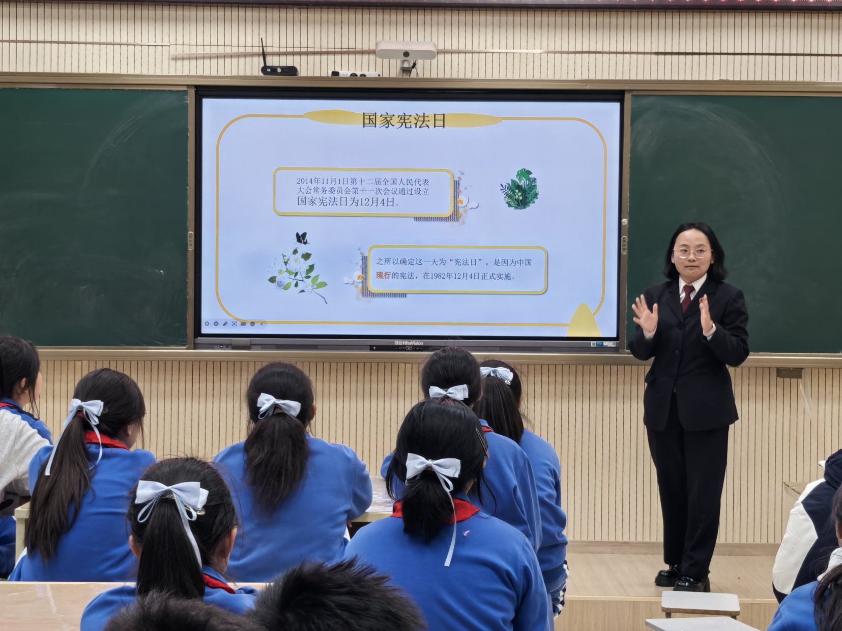 当天上午,阳光小学多媒体教室内气氛热烈,来自昆明铁检分院的检察官以图文并茂的形式,为孩子们带来了一堂别开生面的宪法启蒙课。活动一开始,检察官就通过生动的历史图片和清晰的时间轴,为同学们揭开了 “国家宪法日” 的神秘面纱。“12 月 4 日不只是一个纪念日哦!” 检察官强调,这一天更是全民宪法教育日、法治文化普及日,大家瞬间明白宪法与每个人的生活都息息相关。