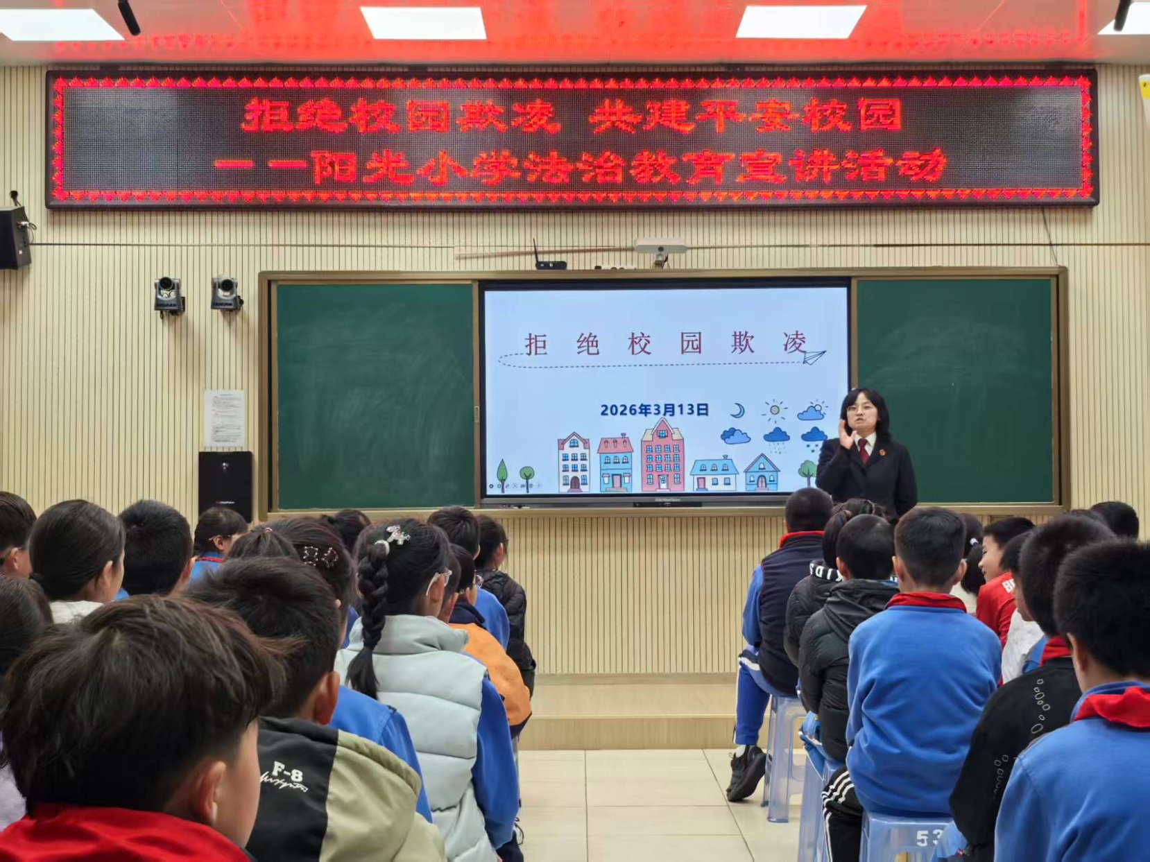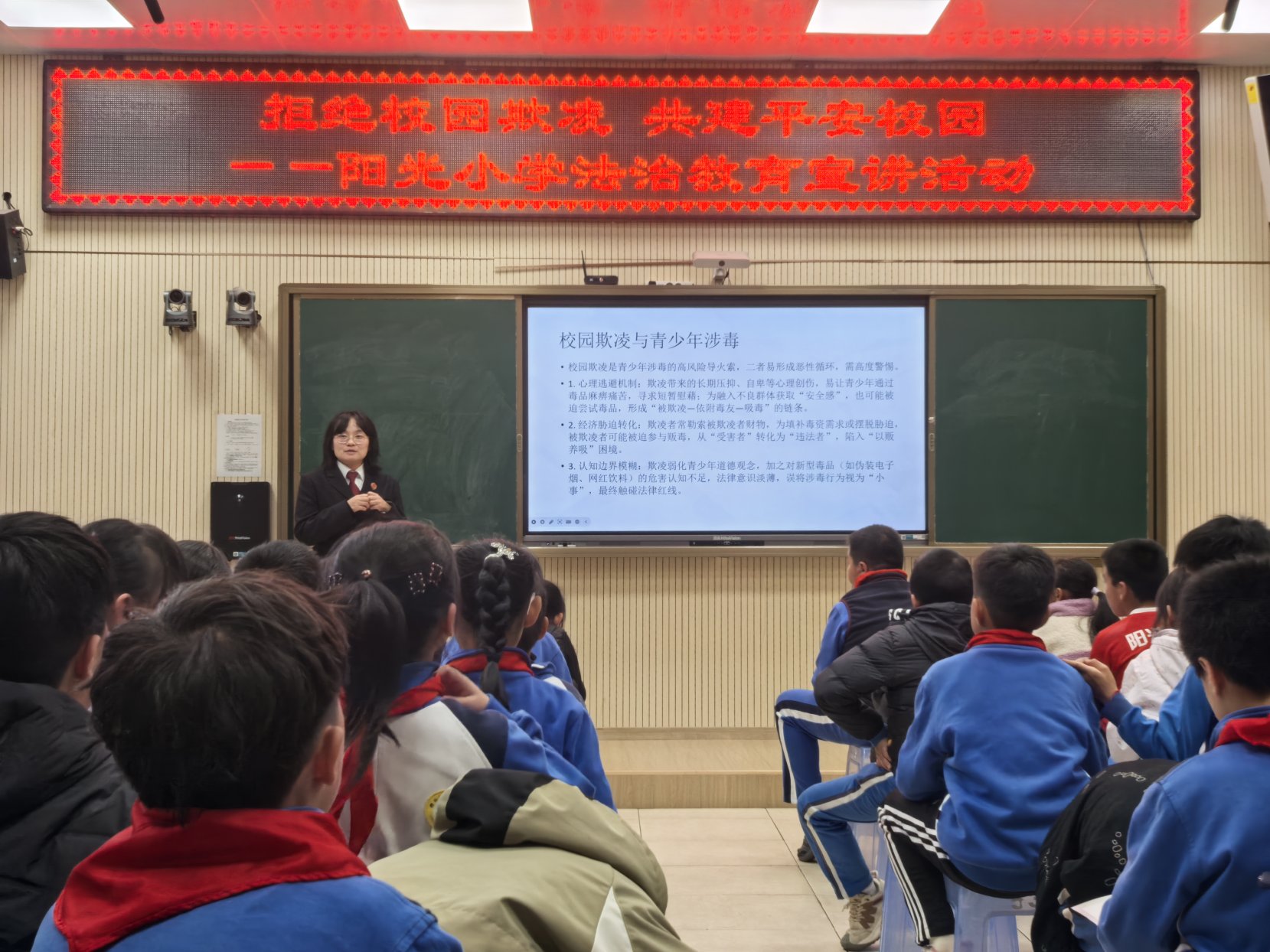 3月13日,昆明铁检两级院组织检察人员走进西山区阳光小学,开展以“预防校园欺凌,远离毒品诱惑”为主题的“法治护航开学季”普法活动,为四年级百余名师生带来一堂生动的法治课。