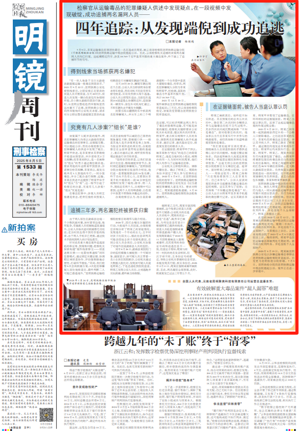 针对此类重大毒品案件追逃面临的取证难、到案难问题,检察机关探索构建“案件线索移交——侦查进展反馈——处置结果通报”闭环监督模式,通过锁定关键证据、协调跨区域侦查协作、评估强制措施必要性,打破环节壁垒。“其间,我们检警5次会商抓捕方案,3次赴犯罪嫌疑人居住地排查后,最终判断二人可能已潜逃境外。”昆明铁路运输检察院检察官助理邓与骁介绍说。