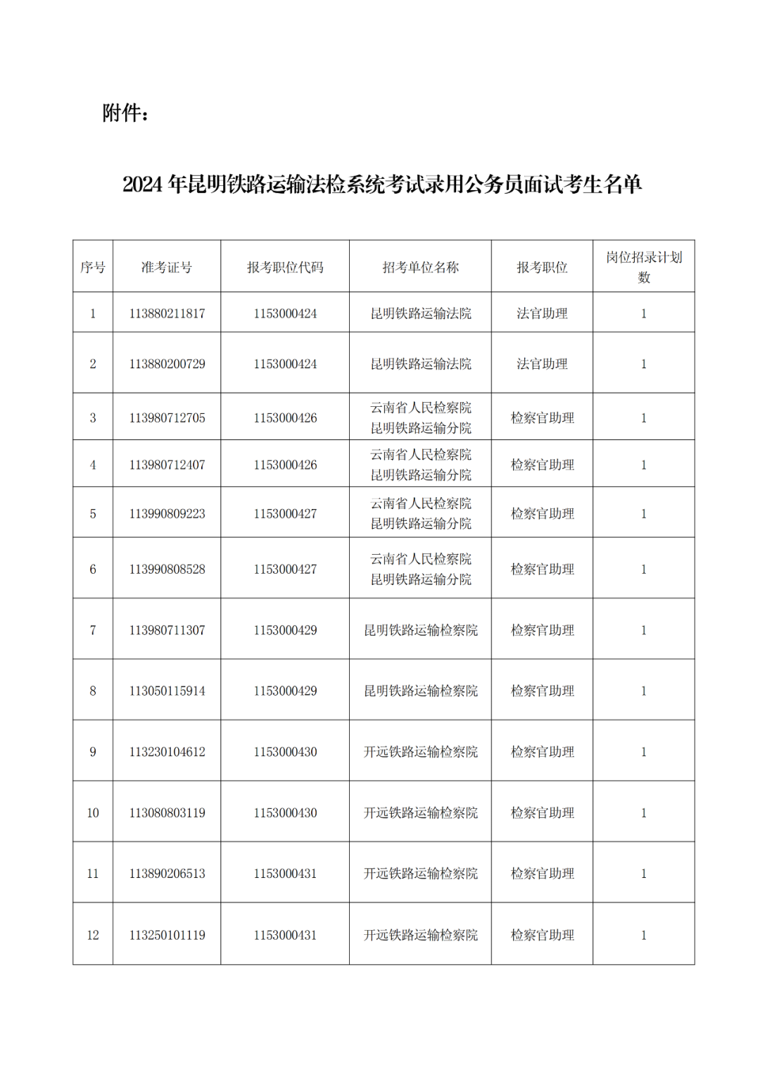 附件:2024年昆明铁路运输法检系统考试录用公务员面试考生名单